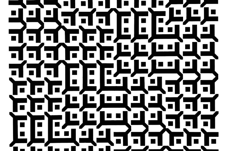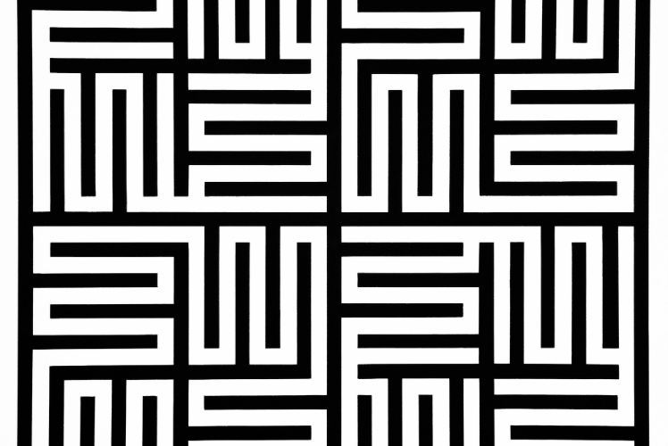 Pablo Bouteiller nous offre de faire en sa compagnie ce double voyage simultané à travers sa série des Black and white qui se décline comme une recherche de l’égarement. Des labyrinthes, il en est de ronds, qui jouent de la spirale, il en est de sphériques aussi, qui font passer de haut en bas et de bas en haut. On n’en trouvera chez lui que de carrés et de rectangulaires : c’est la ligne qui est à l’honneur, ligne droite, brisée, angulaire ou diagonale, mais toujours domine l’impression ici qu’un plan ordonné régit le sens de la marche et du regard. On pense à la géométrie rêveuse d’un Klee bien sûr, à l’architecture complexe d’une Vieira da Silva aussi, ou encore aux polyptyques savants d’un Sol Lewitt, à toutes ces petites formes assemblées qui insistent, se répètent, se juxtaposent, se redisent à l’infini comme autant de développements logiques d’une cellule originaire.